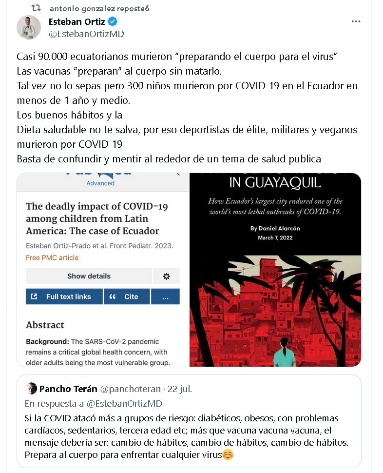 Casi 90.000 ecuatorianos murieron “preparando el cuerpo para el virus” Las vacunas “preparan” al cuerpo sin matarlo. Tal vez no lo sepas pero 300 niños murieron por COVID 19 en el Ecuador en menos de 1 año y medio. Los buenos hábitos y la Dieta saludable no te salva, por eso deportistas de élite, militares y veganos murieron por COVID 19 Basta de confundir y mentir al rededor de un tema de salud publica