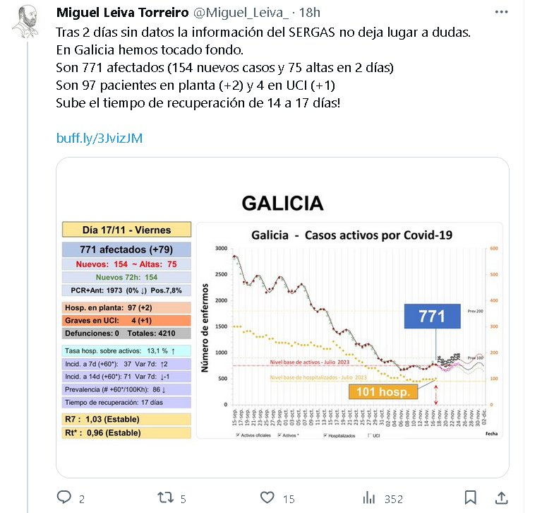 COVID Tras 2 días sin datos la información del SERGAS no deja lugar a dudas. En Galicia hemos tocado fondo. Son 771 afectados (154 nuevos casos y 75 altas en 2 días) Son 97 pacientes en planta (+2) y 4 en UCI (+1) Sube el tiempo de recuperación de 14 a 17 días!