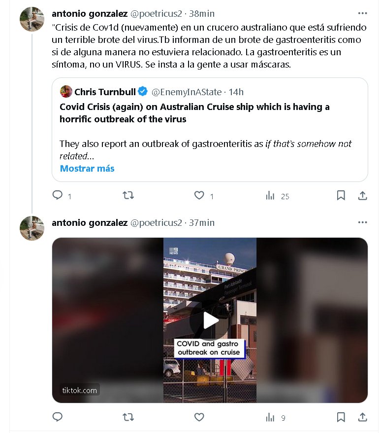 Crisis de Covid (nuevamente) en un crucero australiano que está sufriendo un terrible brote del virus.Tb informan de un brote de gastroenteritis como si de alguna manera no estuviera relacionado. La gastroenteritis es un síntoma, no un VIRUS. Se insta a la gente a usar máscaras.