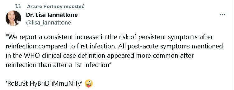 IRONÍA ANTE LA ESTUPIDEZ COLECTIVA (EN INGLÉS) Dra. Lisa Iannattone @lisa_iannattone “Reportamos un aumento constante en el riesgo de síntomas persistentes después de la reinfección en comparación con la primera infección. Todos los síntomas posagudos mencionados en la definición de caso clínico de la OMS parecieron más comunes después de una reinfección que después de una primera infección”. ‘Inmunidad híbrida robusta’ 🤪