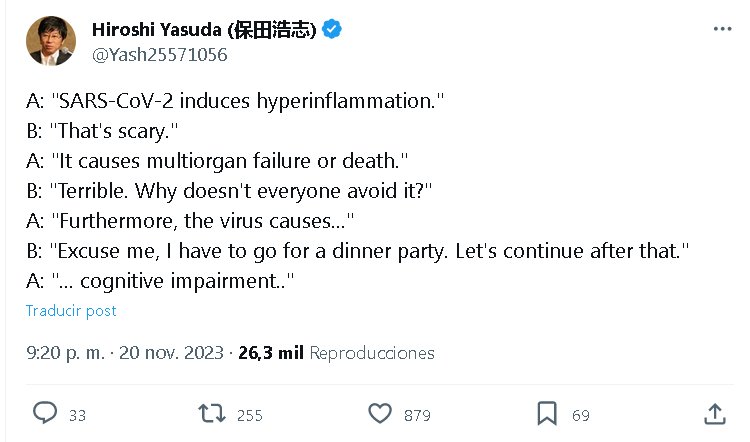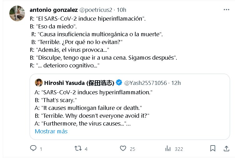 COVIDIANOS VS. COVIDIOTAS R: «El SARS-CoV-2 induce hiperinflamación». B: «Eso da miedo». R: «Causa insuficiencia multiorgánica o la muerte». B: «Terrible. ¿Por qué no lo evitan?» R: «Además, el virus provoca…» B: «Disculpe, tengo que ir a una cena. Sigamos después». R: «… deterioro cognitivo…»