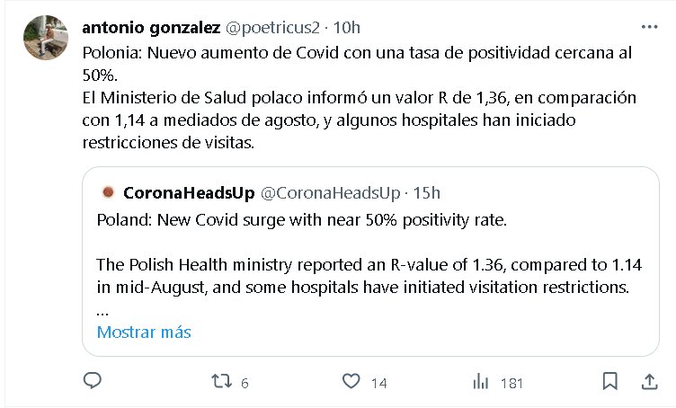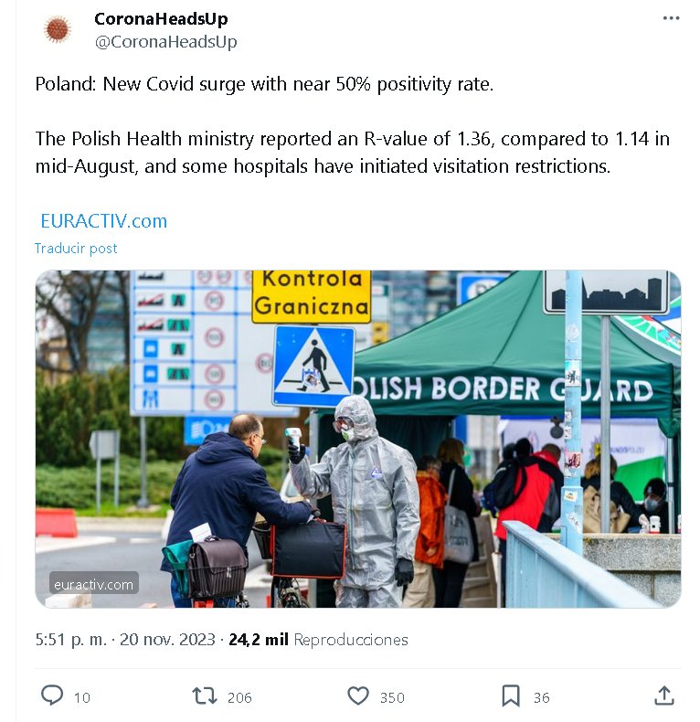 «FIN DE PANDEMIA» Polonia: Nuevo aumento de Covid con una tasa de positividad cercana al 50%. El Ministerio de Salud polaco informó un valor R de 1,36, en comparación con 1,14 a mediados de agosto, y algunos hospitales han iniciado restricciones de visitas