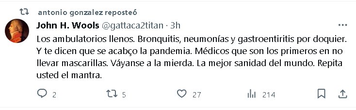 TESTIMONIALES Los ambulatorios llenos. Bronquitis, neumonías y gastroentiritis por doquier. Y te dicen que se acabó la pandemia. Médicos que son los primeros en no llevar mascarillas. Váyanse a la mierda. La mejor sanidad del mundo. Repita usted el mantra.