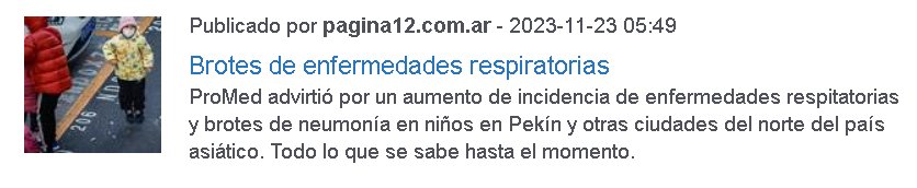 Brotes de enfermedades respiratorias Publicado por pagina12.com.ar – 2023-11-23 05:49 Posted on noviembre 23, 2023 por coronado https://www.pagina12.com.ar/688338-alerta-en-china-por-una-extrana-neumonia-que-afecta-a-ninos-