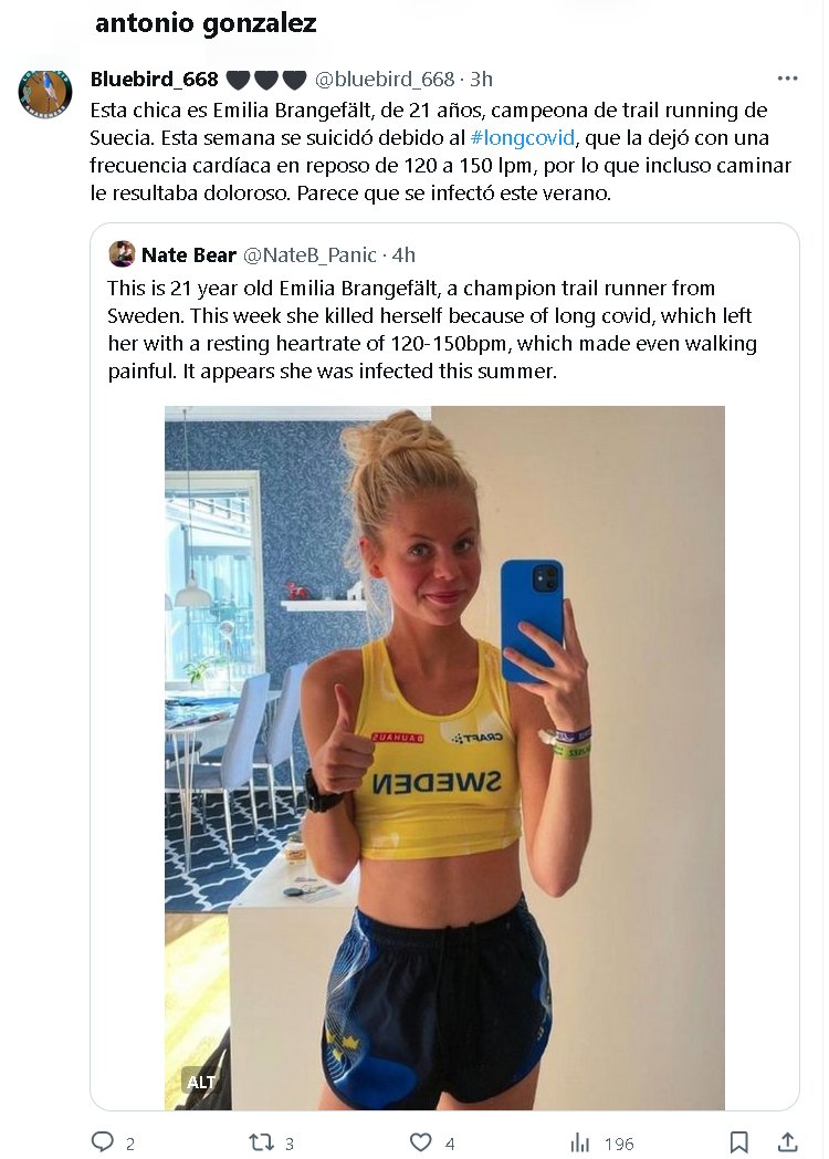 Esta chica es Emilia Brangefält, de 21 años, campeona de trail running de Suecia. Esta semana se suicidó debido al #longcovid, que la dejó con una frecuencia cardíaca en reposo de 120 a 150 lpm, por lo que incluso caminar le resultaba doloroso. Parece que se infectó este verano.