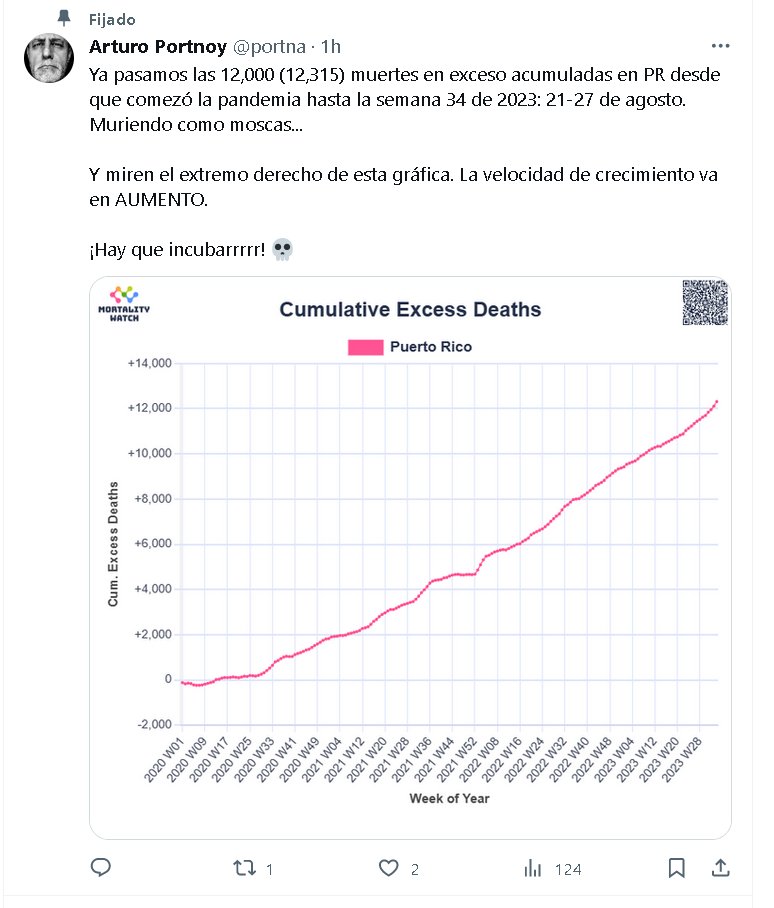 Ya pasamos las 12,000 (12,315) muertes en exceso acumuladas en PR desde que comezó la pandemia hasta la semana 34 de 2023: 21-27 de agosto. Muriendo como moscas… Y miren el extremo derecho de esta gráfica. La velocidad de crecimiento va en AUMENTO