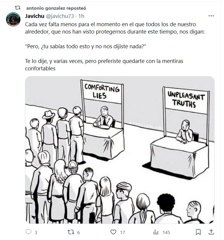 Cada vez falta menos para el momento en el que todos los de nuestro alrededor, que nos han visto protegernos durante este tiempo, nos digan: «Pero, ¿tu sabías todo esto y no nos dijiste nada?» Te lo dije, y varias veces, pero preferiste quedarte con la mentiras confortables