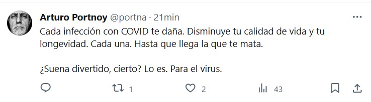 Cada infección con COVID te daña. Disminuye tu calidad de vida y tu longevidad. Cada una. Hasta que llega la que te mata. ¿Suena divertido, cierto? Lo es. Para el virus. Posted on noviembre 26, 2023 por coronado