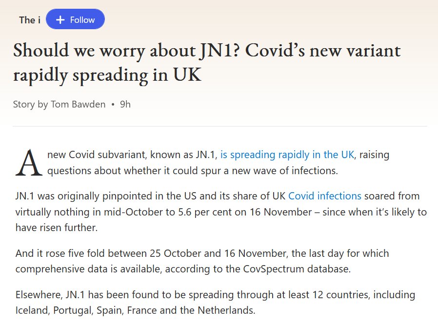 EN INGLÉS ¿Deberíamos preocuparnos por JN1? La nueva variante de Covid se propaga rápidamente en el Reino Unido Posted on noviembre 26, 2023 por coronado https://www.msn.com/en-gb/health/medical/should-we-worry-about-jn1-covid-s-new-variant-rapidly-spreading-in-uk/ar-AA1kxtfz