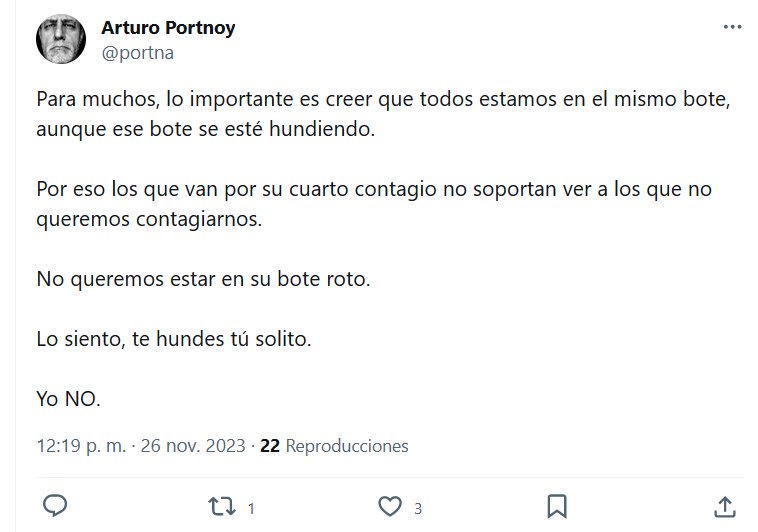 Para muchos, lo importante es creer que todos estamos en el mismo bote, aunque ese bote se esté hundiendo. Por eso los que van por su cuarto contagio no soportan ver a los que no queremos contagiarnos. No queremos estar en su bote roto. Lo siento, te hundes tú solito. Yo NO