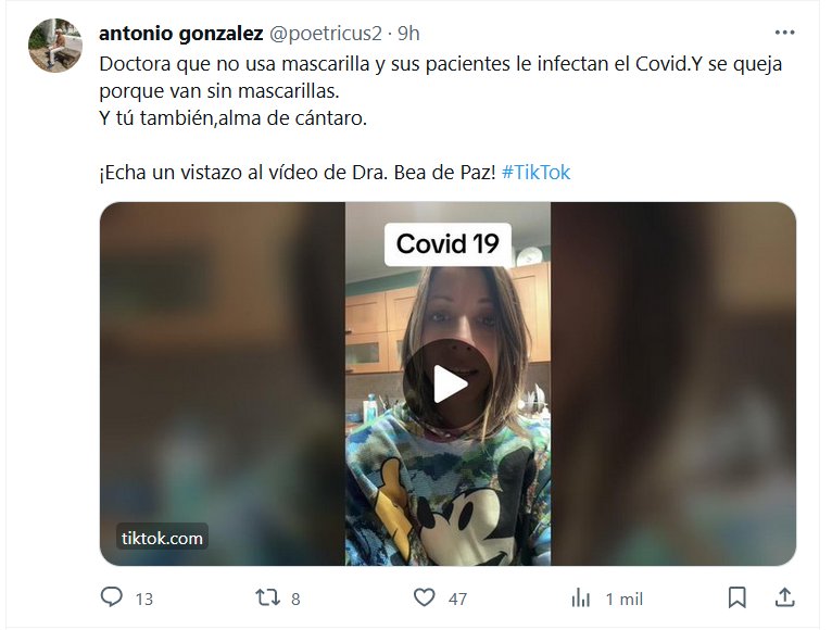 PREDICANDO CON EL DESEJEMPLO Doctora que no usa mascarilla y sus pacientes le infectan el Covid. Y se queja porque van sin mascarillas. Y tú también, alma de cántaro Posted on noviembre 28, 2023 por coronado https://www.tiktok.com/@snbeadepaz/video/7305879018694380832?_t=8hj7upqhKeP&_r=1