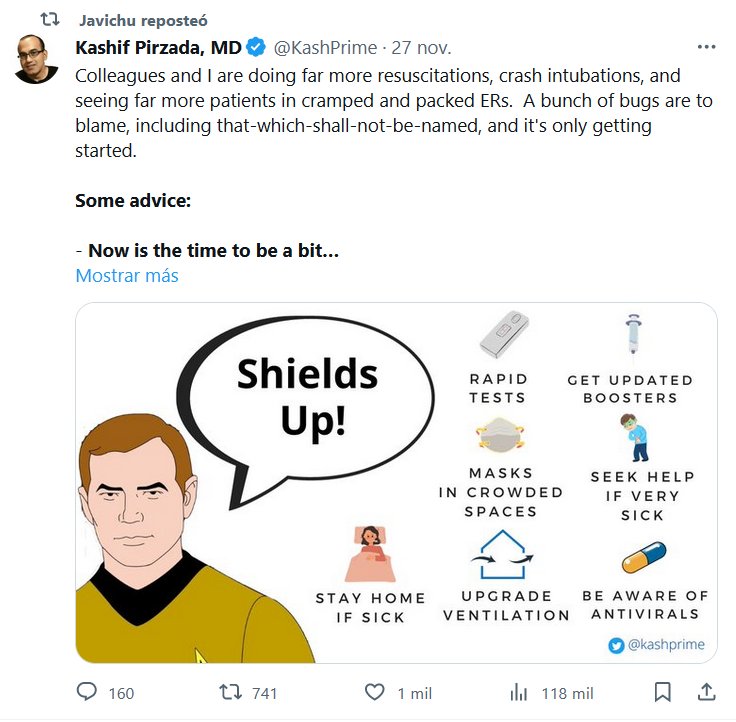 Mis colegas y yo estamos realizando muchas más reanimaciones, intubaciones de emergencia y atendiendo a muchos más pacientes en salas de emergencia abarrotadas y abarrotadas. La culpa la tienen un montón de errores, incluido el que no debe ser nombrado, y esto apenas está comenzando. Algún consejo: - Ahora es el momento de tener un poco más de cuidado en espacios concurridos o mal ventilados, como el metro, el autobús o el avión. Tal vez cambie a la FMH (trabajo desde casa) si está disponible, o use una máscara de buena calidad cuando viaje o esté en el trabajo/escuela o en tiendas/centros comerciales llenos de gente. - Tener un plan de antivirales si estás en una categoría vulnerable. Algunas jurisdicciones los dispensan fácilmente a través de farmacias, otras mediante una solicitud en línea; infórmate con antelación. - Si tienes síntomas de resfriado o gripe, ¡quédate en casa! Ya no es socialmente aceptable "aguantar" en el trabajo y tus compañeros de trabajo te odiarán si lo intentas. - Cuando esté enfermo con síntomas de resfriado/gripe, utilice pruebas rápidas para comprobarlo. No hay forma clínica de diferenciar un simple resfriado de la gripe o el C19. Es posible que usted tenga un curso leve, pero un miembro de la familia más vulnerable o desafortunado podría no tenerlo, y le podría ir mal. - Recibe vacunas actualizadas mientras puedas. Anécdota: un pariente anciano contrajo Covid esta semana, su esposa no. Ambos fueron impulsados hace 3 semanas. Ahora está tomando Paxlovid y aislado del resto de la familia (lo que incluye mantenerse alejado de niños pequeños y familiares embarazadas). Por lo tanto, la vacuna proporciona cierta protección, aunque no perfecta, contra la infección durante un corto período de tiempo y, por supuesto, una excelente protección contra la hospitalización. - Saber cuándo acudir al hospital. He visto a algunas personas terminar en la UCI esta semana y deberían haber llegado antes para ser evaluadas. En un caso, estaban tomando múltiples tratamientos con antibióticos para un "resfriado". No es una lista exhaustiva: - Problemas para respirar, dificultad para respirar, respiración rápida, niveles bajos de oxígeno (en un monitor doméstico) - Dolor en el pecho significativo - Fiebres que duran más de 4-5 días - Ingesta oral deficiente, no puedo comer ni beber mucho, vómitos/diarrea intensos - Tenga cuidado con los viajes, especialmente con los cruceros. Parece que casi todos los amigos o pacientes que regresan de viajes de larga distancia y cruceros se enferman. - Cuando te recuperes, pero te sientas sin aliento, letárgico y un poco confuso, no intentes superarlo. Eso podría provocar que estos síntomas se mantengan a largo plazo (el temido Long Covid). Tómatelo con calma y deja que tu cuerpo se recupere del daño que se le ha causado, ¡y mejor suerte esquivándolo la próxima vez! ¡Mucha suerte a todos vosotros esta temporada!