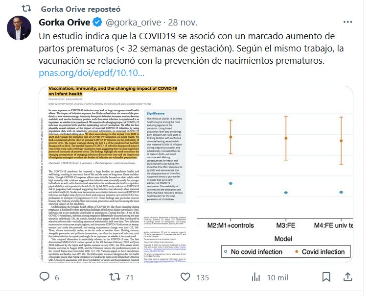 Un estudio indica que la COVID19 se asoció con un marcado aumento de partos prematuros (< 32 semanas de gestación). Según el mismo trabajo, la vacunación se relacionó con la prevención de nacimientos prematuros