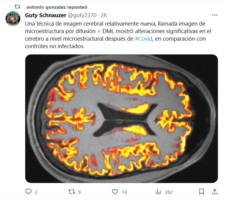 Una técnica de imagen cerebral relativamente nueva, llamada imagen de microestructura por difusión = DMI, mostró alteraciones significativas en el cerebro a nivel microestructural después de #Covid, en comparación con controles no infectados