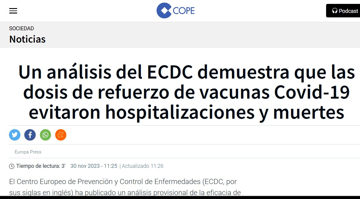 Un análisis del ECDC demuestra que las dosis de refuerzo de vacunas Covid-19 evitaron hospitalizaciones y muertes Posted on noviembre 30, 2023 por coronado https://www.cope.es/actualidad/sociedad/noticias/analisis-del-ecdc-demuestra-que-las-dosis-refuerzo-vacunas-covid-19-evitaron-hospitalizaciones-muertes-20231130_3028577