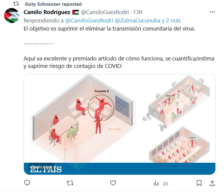 Aquí va excelente y premiado artículo de cómo funciona, se cuantifica/estima y suprime riesgo de contagio de COVID Posted on diciembre 1, 2023 por coronado https://elpais.com/especiales/coronavirus-covid-19/un-salon-un-bar-y-una-clase-asi-contagia-el-coronavirus-en-el-aire/