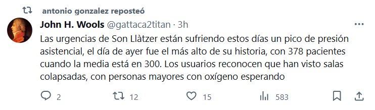 NOCOVID HACE ESTRAGOS Las urgencias de Son Llàtzer (HOSPITAL DE PALMA DE MALLORCA, BALEARES, ESPAÑA) están sufriendo estos días un pico de presión asistencial, el día de ayer fue el más alto de su historia, con 378 pacientes cuando la media está en 300. Los usuarios reconocen que han visto salas colapsadas, con personas mayores con oxígeno esperando