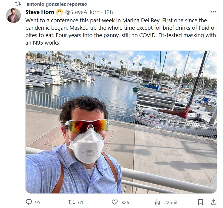 TESTIMONIOS Fui a una conferencia la semana pasada en Marina Del Rey. La primera desde que empezó la pandemia. Enmascarado todo el tiempo excepto para beber líquidos brevemente o comer algo. Cuatro años después de la pandemia, todavía no tengo COVID. La mascarilla N95 funciona!