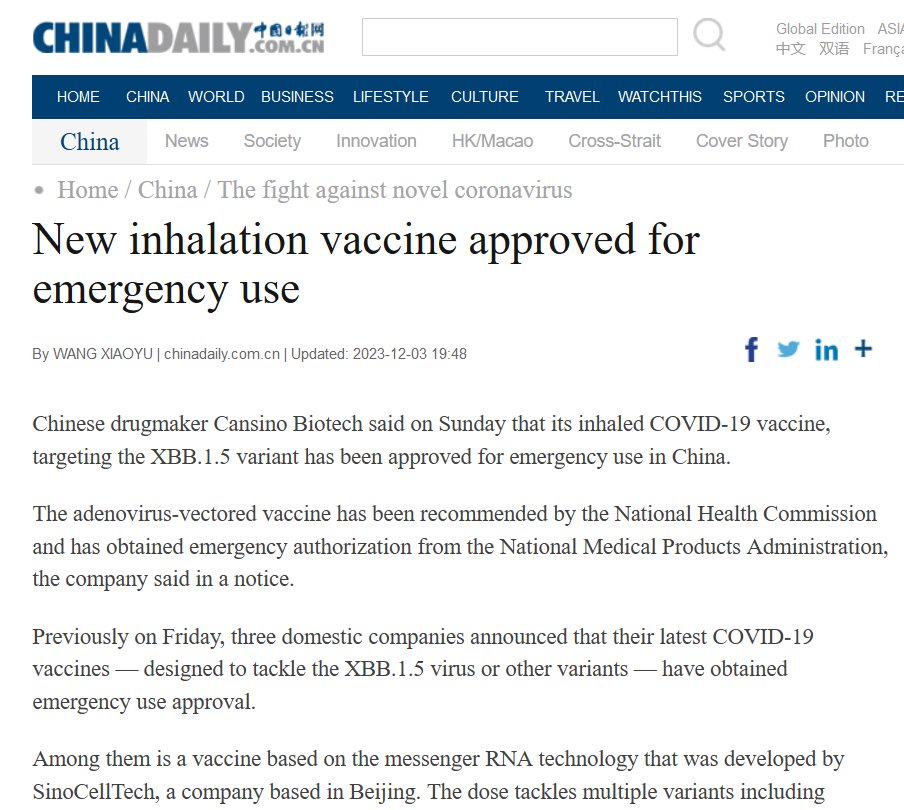 La farmacéutica china Cansino Biotech dijo el domingo que su vacuna inhalada contra el COVID-19, dirigida a la variante XBB.1.5, ha sido aprobada para uso de emergencia en China.