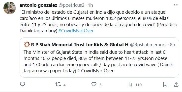 «ES LEVE», TE MINTIERON… «El ministro del estado de Gujarat en India dijo que debido a un ataque cardíaco en los últimos 6 meses murieron 1052 personas, el 80% de ellas entre 11 y 25 años, no obesas y después de la ola aguda de covid» (Periódico Dainik Jagran hoy).#CovidIsNotOver