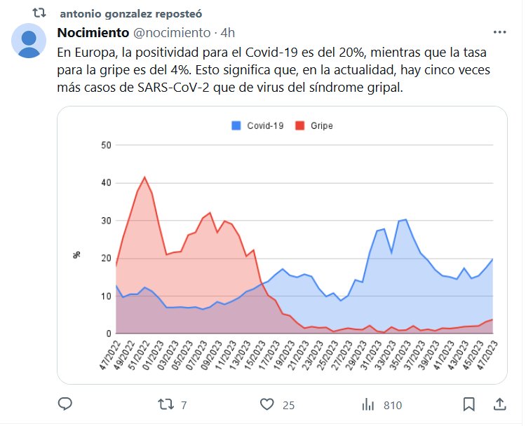 LA ÚNICA VERDAD ES LA REALIDAD En Europa, la positividad para el Covid-19 es del 20%, mientras que la tasa para la gripe es del 4%. Esto significa que, en la actualidad, hay cinco veces más casos de SARS-CoV-2 que de virus del síndrome gripal.