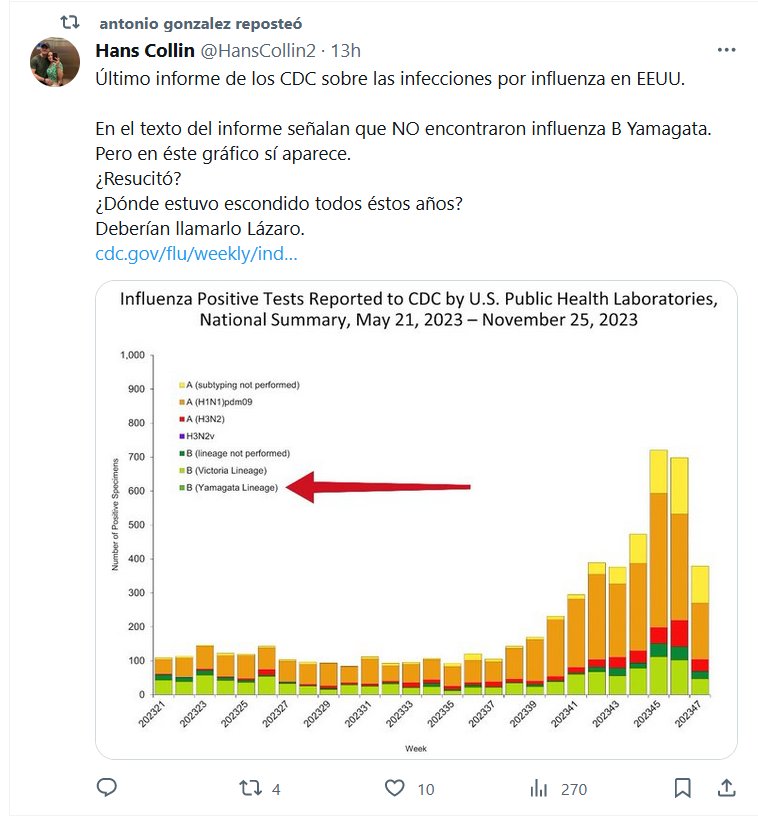 OMS, CDC, MIENTEN COVID Y EN TODO Último informe de los CDC sobre las infecciones por influenza en EEUU. En el texto del informe señalan que NO encontraron influenza B Yamagata. Pero en éste gráfico sí aparece. ¿Resucitó? ¿Dónde estuvo escondido todos éstos años? Deberían llamarlo Lázaro.
