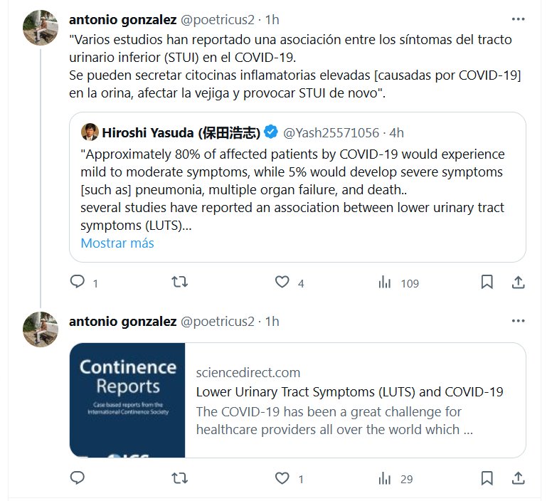 «Varios estudios han reportado una asociación entre los síntomas del tracto urinario inferior (STUI) en el COVID-19. Se pueden secretar citocinas inflamatorias elevadas [causadas por COVID-19] en la orina, afectar la vejiga y provocar STUI de novo».