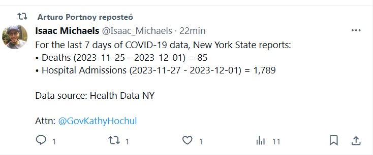 «FIN DE PANDEMIA» EN INGLÉS Para los últimos 7 días de datos de COVID-19, el estado de Nueva York informa: • Muertes (2023-11-25 – 2023-12-01) = 85 • Ingresos hospitalarios (2023-11-27 – 2023-12-01) = 1,789 Fuente de datos: Datos de salud NY