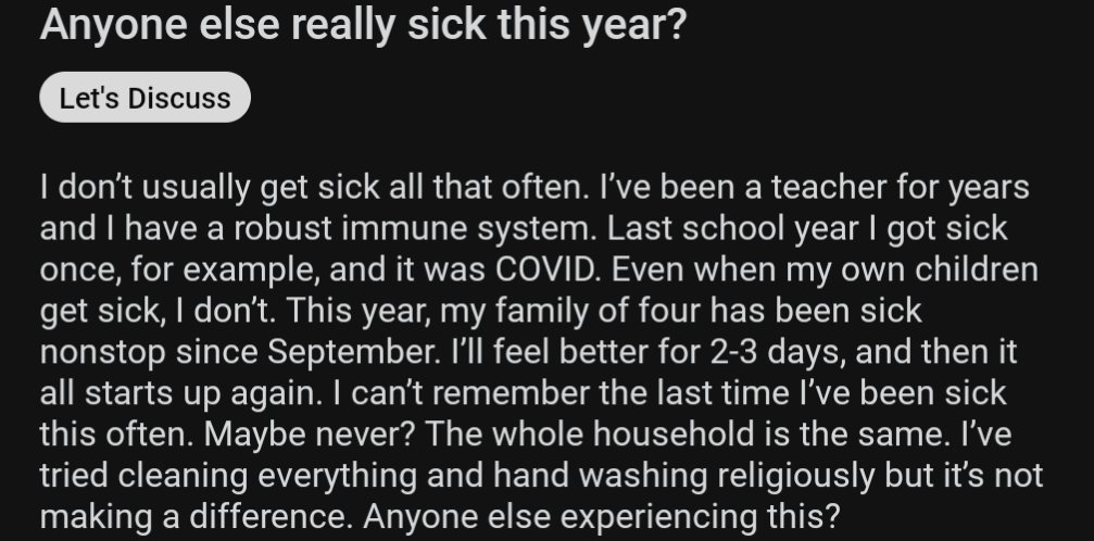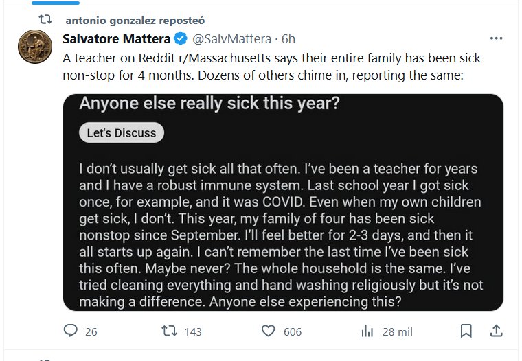 TESTIMONIOS (EN INGLÉS) Un maestro en Reddit r/Massachusetts dice que toda su familia ha estado enferma sin parar durante 4 meses. Docenas más intervienen y reportan lo mismo. «Y ERA COVID» Posted on diciembre 5, 2023 por coronado