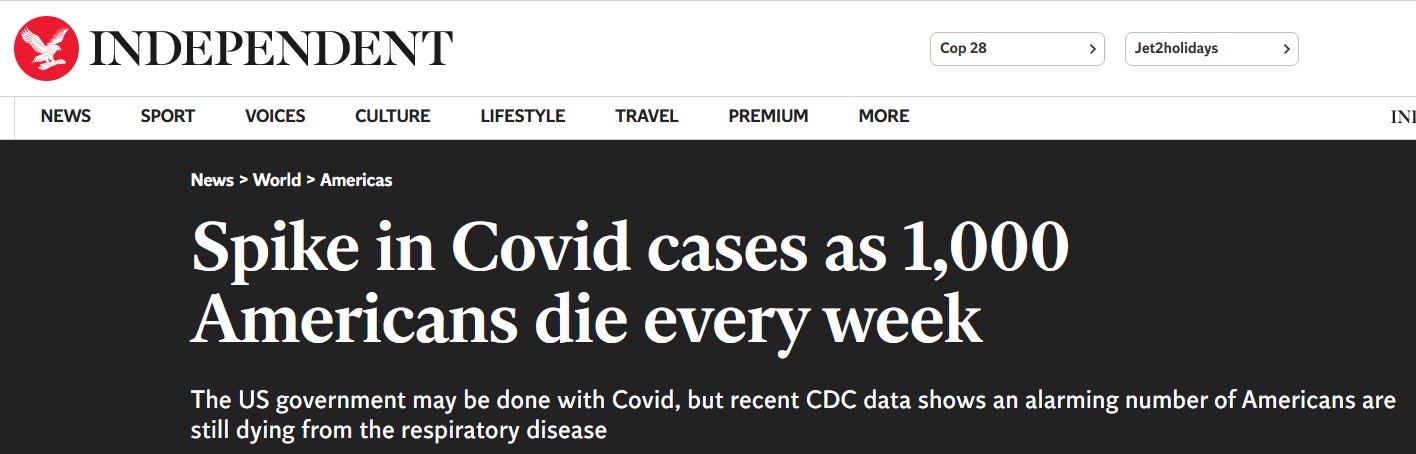 EN INGLÉS Aumento en los casos de Covid: 1.000 estadounidenses mueren cada semana Posted on diciembre 7, 2023 por coronado https://www.independent.co.uk/news/world/americas/covid-symptoms-cases-new-spike-b2460186.html