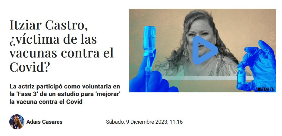 Itziar Castro, ¿víctima de las vacunas contra el Covid? La actriz participó como voluntaria en la ‘Fase 3’ de un estudio para ‘mejorar’ la vacuna contra el Covid Posted on diciembre 9, 2023 por coronado https://www.edatv.news/noticias/55316/itziar-castro-victima-de-las-vacunas-contra-el-covid
