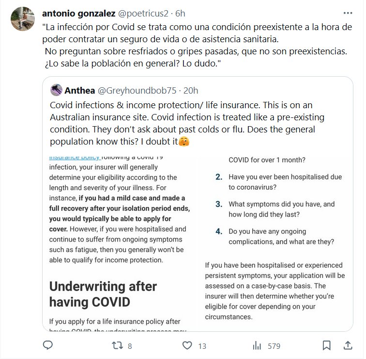 PREGUNTATE POR QUÉ COVIDIOTA! «La infección por Covid se trata como una condición preexistente a la hora de poder contratar un seguro de vida o de asistencia sanitaria. No preguntan sobre resfriados o gripes pasadas, que no son preexistencias. ¿Lo sabe la población en general? Lo dudo.»