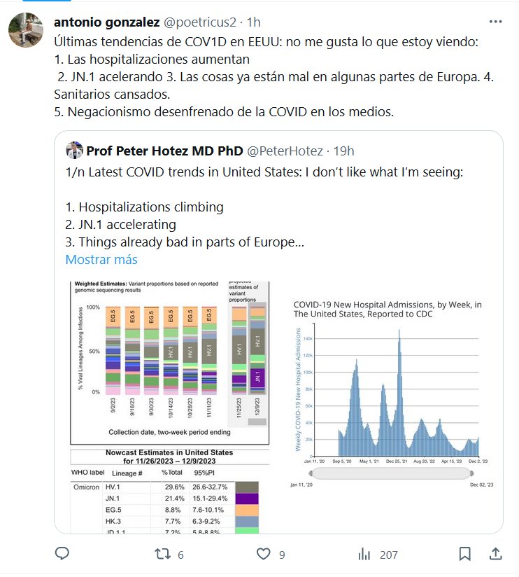Últimas tendencias de COVID en EEUU: no me gusta lo que estoy viendo: 1. Las hospitalizaciones aumentan 2. JN.1 acelerando 3. Las cosas ya están mal en algunas partes de Europa. 4. Sanitarios cansados. 5. Negacionismo desenfrenado de la COVID en los medios