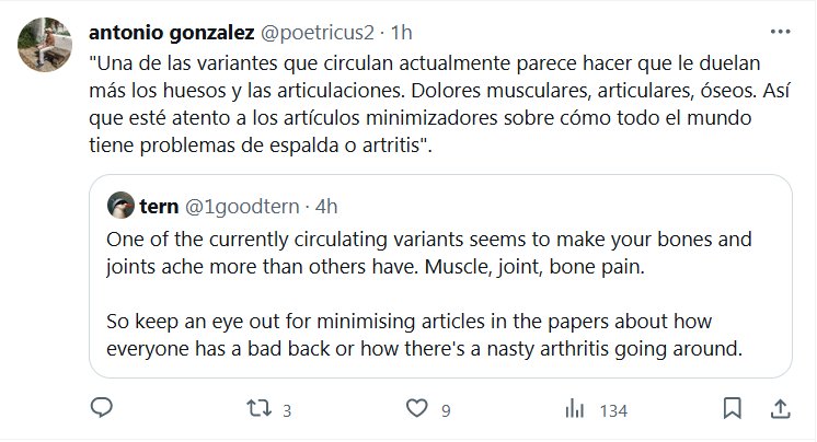 NEVERENDING STORY COVID «Una de las variantes que circulan actualmente parece hacer que le duelan más los huesos y las articulaciones. Dolores musculares, articulares, óseos. Así que esté atento a los artículos minimizadores sobre cómo todo el mundo tiene problemas de espalda o artritis»