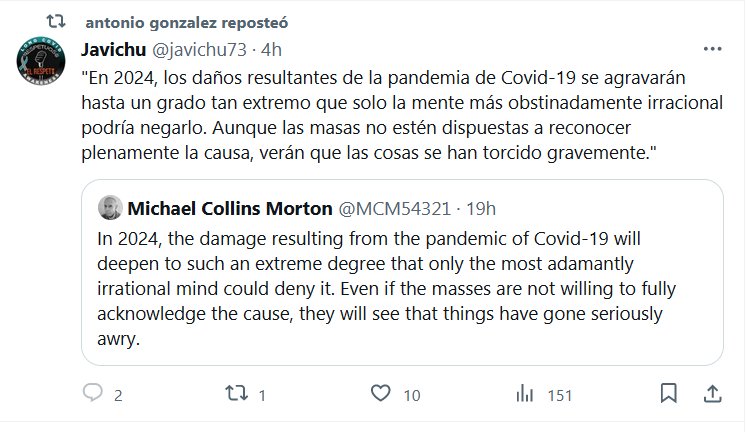 «En 2024, los daños resultantes de la pandemia de Covid-19 se agravarán hasta un grado tan extremo que solo la mente más obstinadamente irracional podría negarlo. Aunque las masas no estén dispuestas a reconocer plenamente la causa, verán que las cosas se han torcido gravemente.»