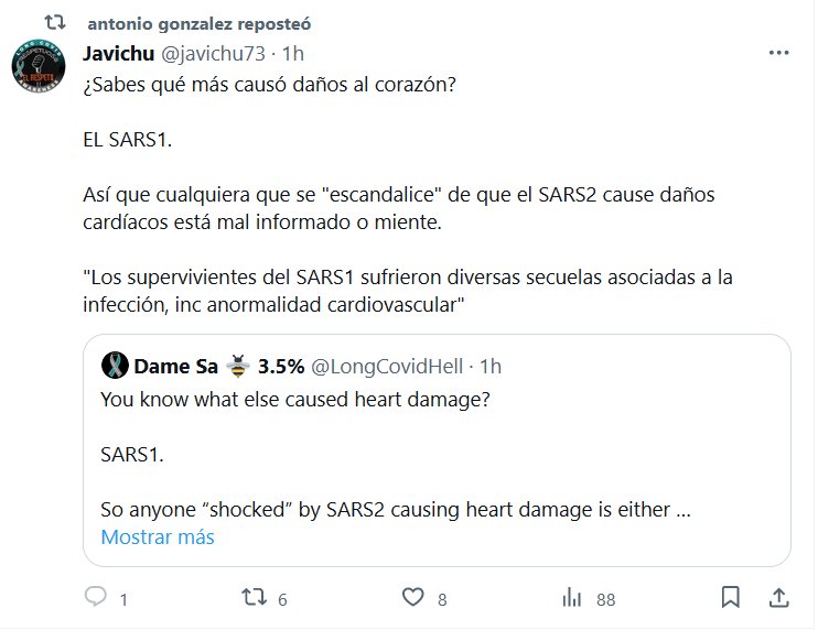 ¿Sabes qué más causó daños al corazón? EL SARS1. Así que cualquiera que se «escandalice» de que el SARS2 cause daños cardíacos está mal informado o miente. «Los supervivientes del SARS1 sufrieron diversas secuelas asociadas a la infección, inc anormalidad cardiovascular»