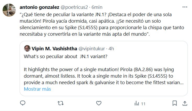 «¿Qué tiene de peculiar la variante JN.1? ¡Destaca el poder de una sola mutación! Pirola yacía dormida, casi apática. ¡¡Se necesitó un solo silenciamiento en su Spike (S:L455S) para proporcionarle la chispa que tanto necesitaba y convertirla en la variante más apta del mundo».