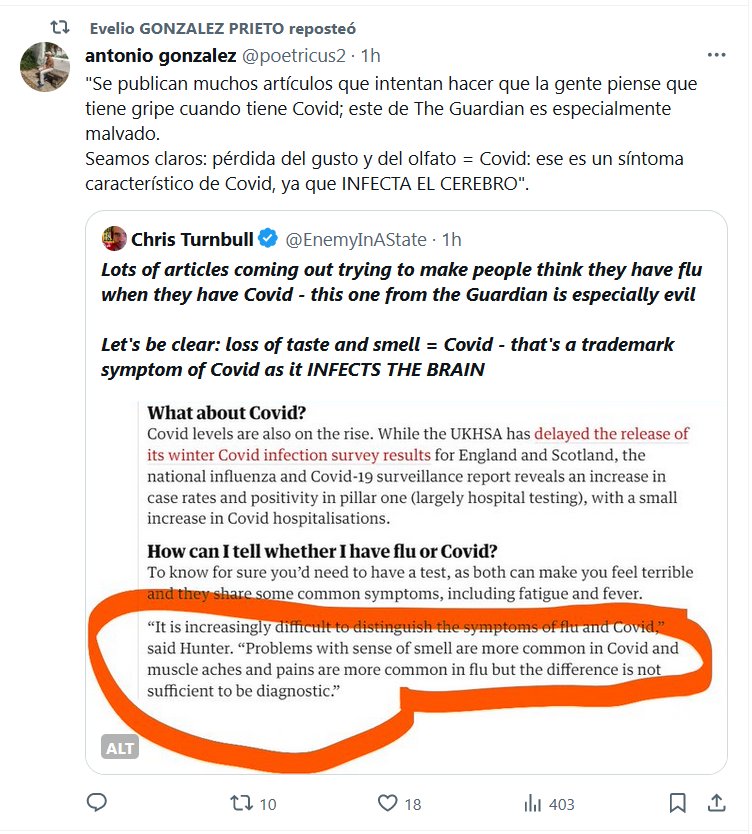 «Se publican muchos artículos que intentan hacer que la gente piense que tiene gripe cuando tiene Covid; este de The Guardian es especialmente malvado. Seamos claros: pérdida del gusto y del olfato = Covid: ese es un síntoma característico de Covid, ya que INFECTA EL CEREBRO».