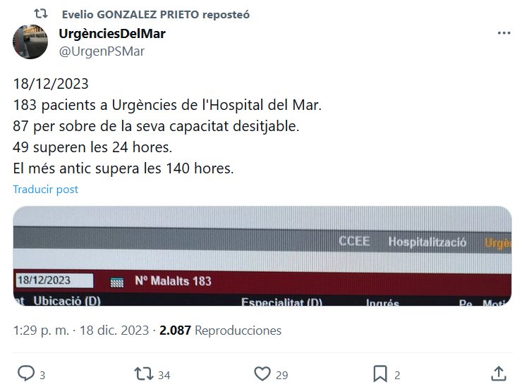 BARCELONA (EN CATALÁN) UrgenciasDelMar @UrgenPSMar 18/12/2023 183 pacientes en Urgencias del Hospital del Mar. 87 por encima de su capacidad deseable. 49 superan las 24 horas. El más antiguo supera las 140 horas