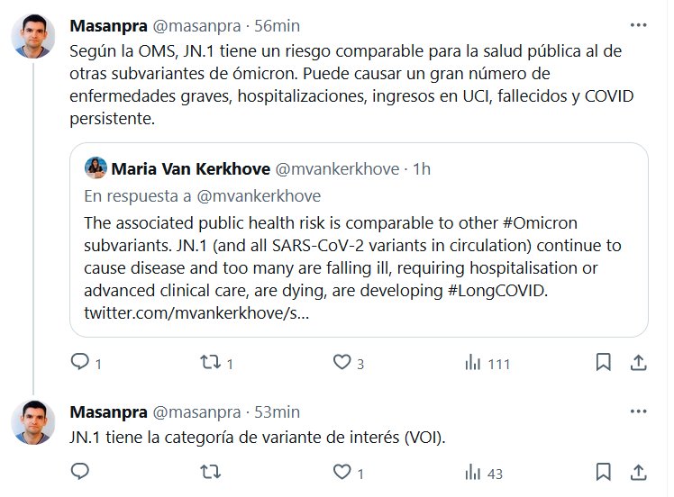 Según la OMS, JN.1 tiene un riesgo comparable para la salud pública al de otras subvariantes de ómicron. Puede causar un gran número de enfermedades graves, hospitalizaciones, ingresos en UCI, fallecidos y COVID persistente