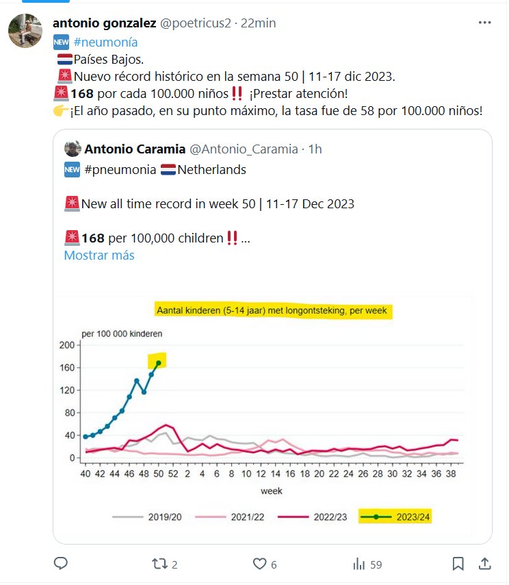 SIN PALABRAS 🆕 #neumonía 🇳🇱Países Bajos. 🚨Nuevo récord histórico en la semana 50 | 11-17 dic 2023. 🚨𝟭𝟲𝟴 por cada 100.000 niños‼️ ¡Prestar atención! 👉¡El año pasado, en su punto máximo, la tasa fue de 58 por 100.000 niños!