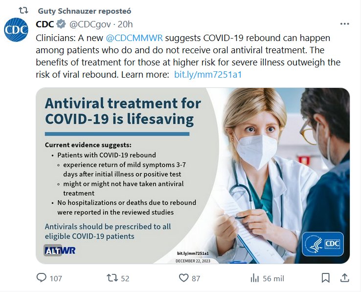 EN INGLÉS Médicos: un nuevo @CDCMMWR sugiere que el rebote de COVID-19 puede ocurrir entre pacientes que reciben y no reciben tratamiento antiviral oral. Los beneficios del tratamiento para quienes tienen mayor riesgo de padecer una enfermedad grave superan el riesgo de rebote viral