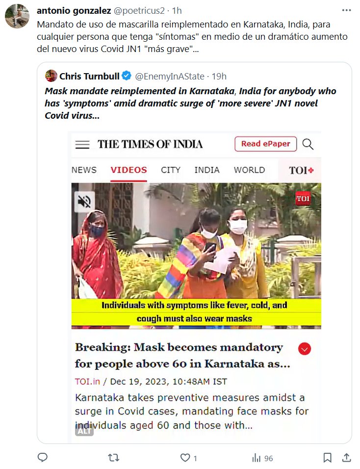 Mandato de uso de mascarilla reimplementado en Karnataka, India, para cualquier persona que tenga «síntomas» en medio de un dramático aumento del nuevo virus Covid JN1 «más grave»… Posted on diciembre 22, 2023 por coronado