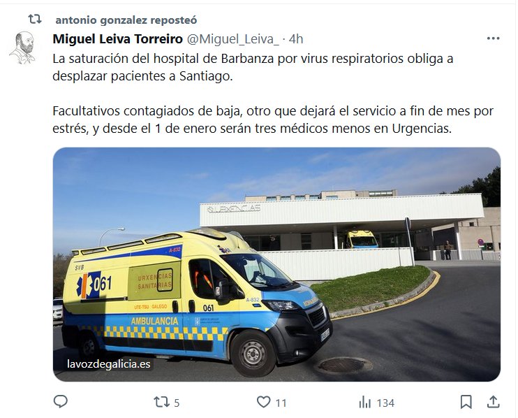 GALICIA, ESPAÑA La saturación del hospital de Barbanza por virus respiratorios obliga a desplazar pacientes a Santiago. Facultativos contagiados de baja, otro que dejará el servicio a fin de mes por estrés, y desde el 1 de enero serán tres médicos menos en Urgencias.
