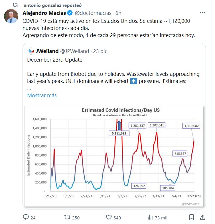 COVID-19 está muy activo en los Estados Unidos. Se estima ~1,120,000 nuevas infecciones cada día. Agregando de este modo, 1 de cada 29 personas estarían infectadas hoy Posted on diciembre 25, 2023 por coronado