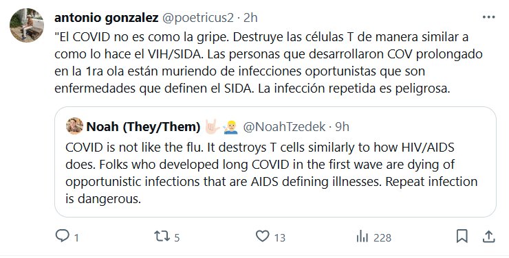 «El COVID no es como la gripe. Destruye las células T de manera similar a como lo hace el VIH/SIDA. Las personas que desarrollaron COV prolongado en la 1ra ola están muriendo de infecciones oportunistas que son enfermedades que definen el SIDA. La infección repetida es peligrosa.