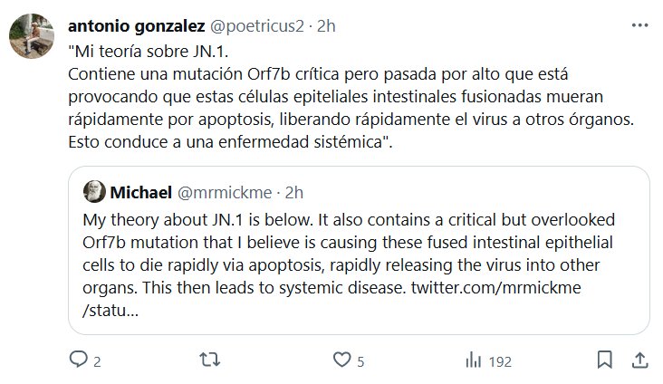 «Mi teoría sobre JN.1. Contiene una mutación Orf7b crítica pero pasada por alto que está provocando que estas células epiteliales intestinales fusionadas mueran rápidamente por apoptosis, liberando rápidamente el virus a otros órganos. Esto conduce a una enfermedad sistémica»