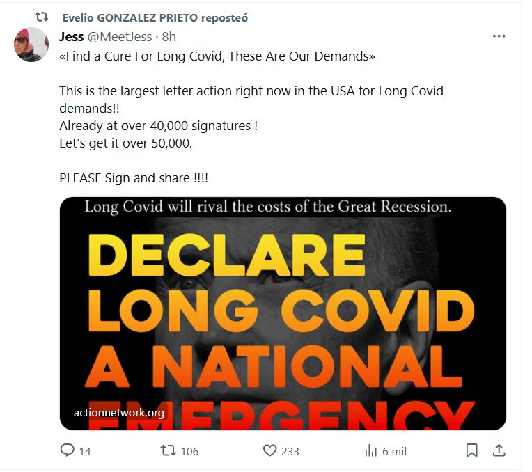 EN INGLÉS «Encontrar una cura para el Covid prolongado: estas son nuestras demandas» ¡Esta es la carta de acción más grande en este momento en los EE. UU. por demandas de Long Covid! ¡Ya tenemos más de 40.000 firmas! Lleguemos a más de 50.000. ¡¡¡POR FAVOR Firma y comparte !!!!