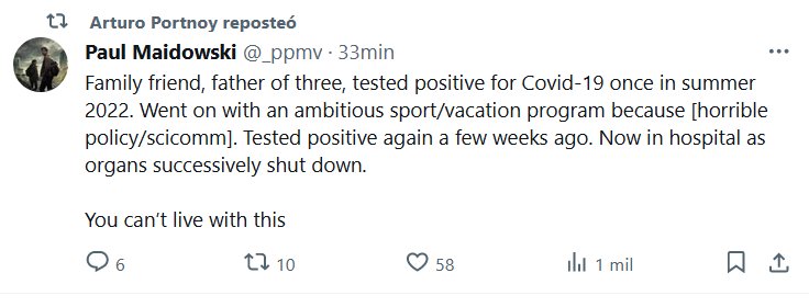 TESTIMONIOS (EN INGLÉS) Amigo de la familia, padre de tres hijos, dio positivo por Covid-19 una vez en el verano de 2022. Siguió con un ambicioso programa deportivo/vacacional porque HAY UNA horrible política… Volvió a dar positivo hace unas semanas. Ahora en el hospital como órganos sucesivamente apagado. No se puede vivir con esto