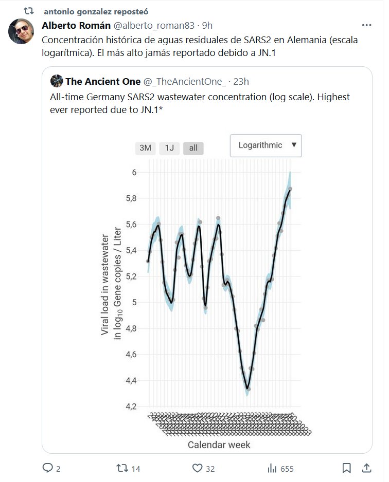 Concentración histórica de aguas residuales de SARS2 en Alemania (escala logarítmica). El más alto jamás reportado debido a JN.1 Posted on diciembre 28, 2023 por coronado